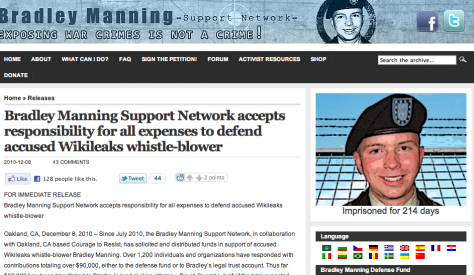 “Ελευθερώστε το Μπράντλεϋ”...Ποιος είναι ο Μπράντλεϋ; Πρόκειται για τον βασικό ύποπτο ,σύμφωνα με τους αμερικανούς για τη διαρροή των απόρρητων εγγράφων στο Wikileaks! Κι αν ο ιδρυτής του Wikileaks κατόρθωσε να γλιτώσει προς το παρόν έστω τα «σίδερα της φυλακής» ,ο Μπράντλεϋ Μάννινγκ, έχει συμπληρώσει ήδη 215 ημέρες στη φυλακή και υπάρχει ήδη site υποστηρικτών του που ζητούν την απελευθέρωσή του με σύνθημα «η αποκάλυψη εγκλημάτων πολέμου, δεν είναι έγκλημα».