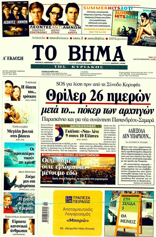 Στις πιέσεις που δέχεται η χώρα μας από το εξωτερικό αλλά και στο ναυάγιο στο οποίο κατέληξε η συνάντηση των πολιτικών αρχηγών κάνουν αναφορά στα πρωτοσέλιδα τους οι Κυριακάτικες εφημερίδες.