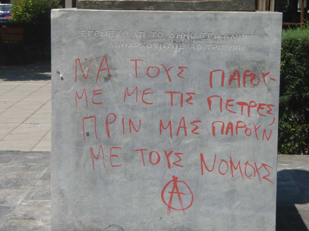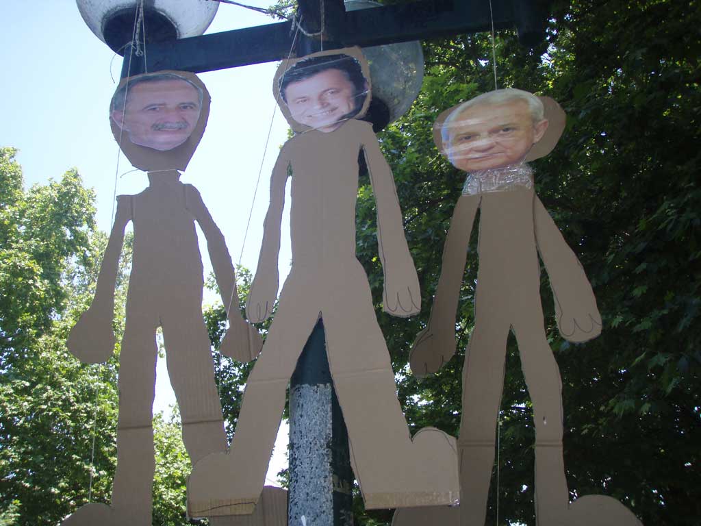 Στην πλατεία των Τρικάλων «κρέμασαν» τους βουλευτές του νομού τους οι Τρικαλινοί! Με κεντρικό σύνθημα το «κ…ες έρχονται κρεμάλες», οι «Αγανακτισμένοι» των Τρικάλων, προτίμησαν αντί …εξωδίκων, να στείλουν πιο «ηχηρό» μήνυμα στους 5 Βουλευτές του Νομού τους οποίους θεωρούν συνυπεύθυνους για την οικονομική κατάσταση της χώρας.